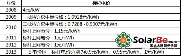 对于大型地面电站项目,基本采用标杆上网电价的补贴形式,只是在不同时期电价标准不同;在2009、2010两年,采用特许权招标对上网电价进行了摸底。