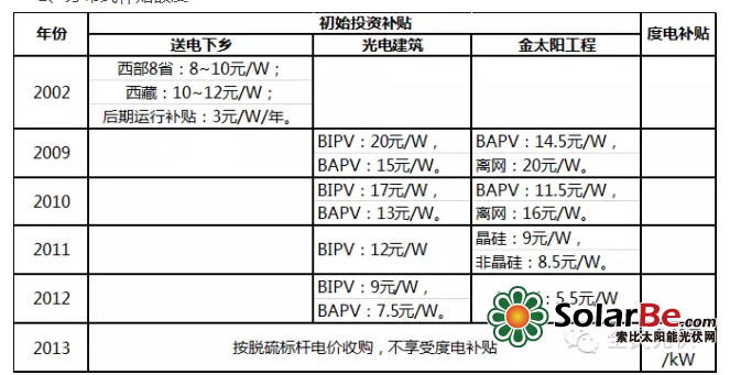 对于分布式光伏项目,2012年及之前基本为初始投资补贴,2013年后开始实行度电补贴;