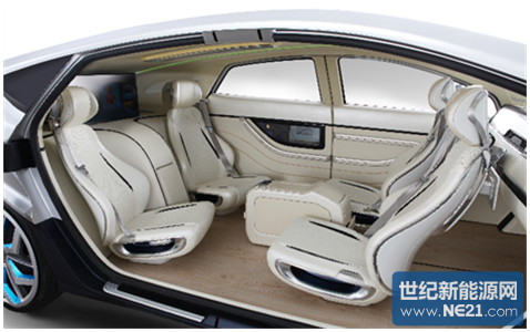 车门设计为对开门,无B柱设计,且车内座椅会自动转为朝外的方向,更方便的进入休息厅般的座舱空间。车舱内中央扶手箱可以前后移动并可大面积展开,同时真皮、木质以及金属材质营造出大气、舒适的氛围。4张座椅使用了可变式座椅系统,分别为独立个体,后部配置有可升降电视、4台iPad及车联网系统,可进行4人面对面商务会议。