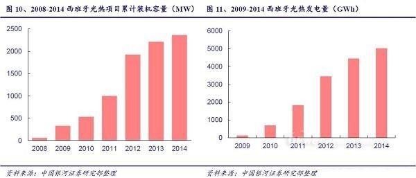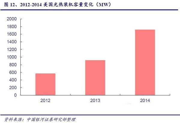美国是最早建设光热电站的国家,早在1983年到1991年的8年间,在美国加利福尼亚州Mojave沙漠就相继建成了槽式光热SEGS1号到9号电站,总装机容量达35.38万千瓦,并入加州电网后运营至今。美国也是2014年新增光热装机最多的国家和拥有世界最大光热电站的国家,2014年美国新增光热装机802MW,占全球的73%,其中Ivanpah塔式电站装机容量高达392MW,是全球装机容量最大的光热电站。