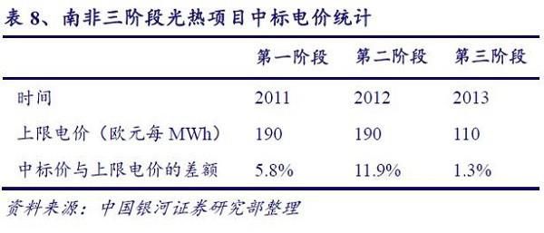 随着技术进步和越来越多的厂商加入竞争,南非光热项目的中标电价呈逐步下降的趋势。第1轮光热发电项目平均中标电价为每度电22美分,第2轮光热发电项目平均中标电价约为每度电21美分。第三轮招标中,由美国SolarReserve和沙特ACWA领衔组成的联合体获得了装机100MW的Redstone塔式光热发电项目的开发权,该项目的投标电价为第一年每度电12.4美分,剩余合同期内收购电价为每度电15美分,几乎只是上两轮光热发电项目招标电价的一半。
