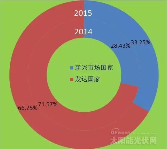 与此相反的是,近几年,新兴市场国家纷纷制定雄心勃勃的可再生能源发展规划,制定政策鼓励可再生能源特别是光伏产业的发展,这极大地促进了这些国家可再生能源的投资。2013年,中国的投资虽然有所下滑但依旧达到613亿美元;而日本则激增55%,达354亿美元。印尼、智利、墨西哥、肯尼亚、南非和土耳其的可再生能源投资超过10亿美元,约旦、乌拉圭、巴拿马、菲律宾和缅甸等国投资金额在5亿-10亿美元之间。2014年,发展中国家的可再生能源投资达1313亿美元,同比增长36%。其中,中国和日本可再生能源投资达749亿美元,而巴西、印度和南非则分别以76亿美元、74亿美元和55亿美元位列全球10大可再生能源投资国家;墨西哥、智利、印尼、肯尼亚和土耳其则超过10亿美元。
