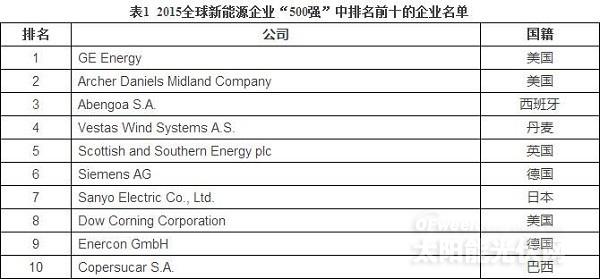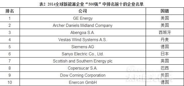 2015“500强”排名前十的企业(见表1)依次为GE Energy(美国)、Archer Daniels Midland Company(美国)、Abengoa S.A.(西班牙)、Vestas Wind Systems A/S(丹麦)、Scottish and Southern Energy PLC(英国)、Siemens AG(德国)、Sanyo Electric Co., Ltd.(日本)、Dow Corning Corporation(美国)、Enercon GmbH(德国)和Copersucar S.A.(巴西)。连续2年,前十的企业中都出现了新兴市场国家企业的身影,而不再是由发达国家企业独霸(见表2);由此可见,新兴市场国家企业的竞争力增强,其与发达国家的差距正减少。