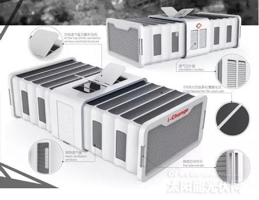 i-Change太阳能灾区组合帐篷在顶部融入CIGS太阳能柔性薄膜电池,可为帐篷提供电量,为灾区的医疗、临时学校、救援指挥中心及生活居住空间提供照明及其他电力所需,环保实用。此外,帐篷拉伸后可组合成像“四合院”一样的空间,方便运输,且便于组装,能更好的规划空间,更方便人们的沟通交流。太阳能灾区组合帐篷可作为工地的临建住房、临街小商店、商用篷房等空间使用。