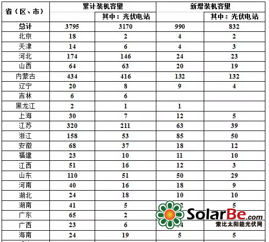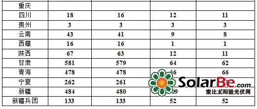全国各省(区、市)中,累计光伏发电装机容量超过100万千瓦的达9个,分别为新疆(含兵团)617万千瓦、甘肃581万千瓦、青海478万千瓦、内蒙古434万千瓦、江苏320万千瓦、宁夏262万千瓦、河北174万千瓦、浙江158万千瓦、山东110万千瓦。