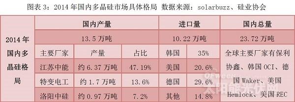 2014年我国多晶硅总量比2013年16.2万吨增长了7.52万吨,涨幅高达