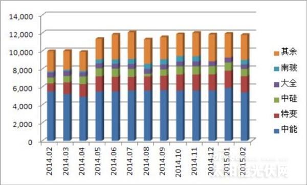 硅业分会统计,2015年1-2月份国内多晶硅产量为2.37万吨,1月份产量为1.19万吨,2月份产量为1.18万吨。目前全国在产企业17家(包括正常检修企业),江苏中能和特变电工均超负荷运行,目前江苏中能6.5万吨/年改良西门子法及3000吨/年硅烷流化床产能运行稳定,已经保持每月5900吨(按31天算)左右的产量运行。