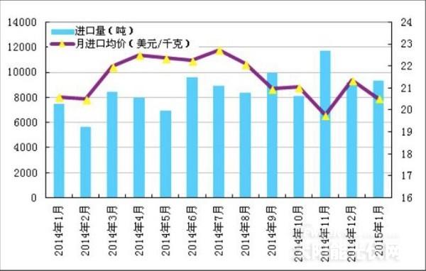46.42%。就数量格局而言,2013年国内产量8.2万吨,进口8万吨,自产与进口比为1.025:1,而2014年国内产量比进口量多3.28万吨,为1.32:1,可见国内生产与进口的比重进一步拉大。