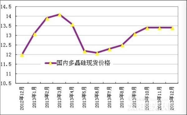 2013年初多晶硅市场止跌反弹,国内现货价格从12年年底的12万元/吨温和上涨至3月底的14.3万元/吨,增幅19.2%,但从4月初开始多晶硅价格逐渐回落,主要是“双反”预期推迟、国外多晶硅倾销加剧、企业出货艰难等因素导致。6月底价格降至12.1万元/吨,跌幅为15.4%。7月初开始,随着业内对“双反”裁决的预期,我国多晶硅价格呈温和上涨态势,直到2013年7月18日商务部发布公告对产自美韩的太阳能级多晶硅采取临时反倾销措施,在反倾销初裁出台的利好因素刺激下,多晶硅价格一路阶段性温和上涨至10月中旬的13.5万元/吨,增幅为11.6%。随后多晶硅价格小幅回落后又回升至12月底的13.5万元/吨。