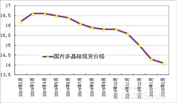 图表7:2014年2月-2015年2月国内多晶硅现货报价单位:万元/吨来源:硅业分会