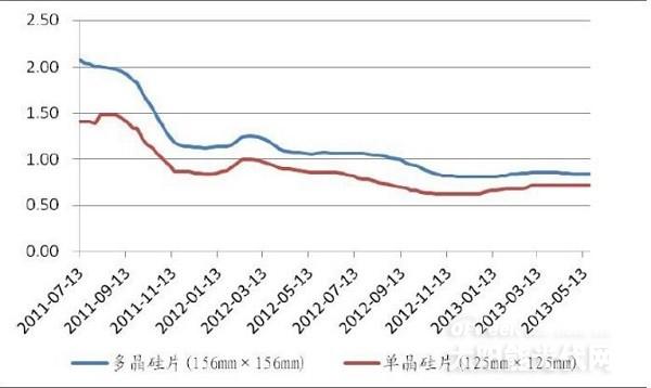 2013年156多晶硅价格稳定在0.842美元,125单晶硅片稳定在0.714美元,需求集中在日本、台湾和韩国市场,价格相对稳定,从结构上说多晶硅片由于价格优势,需求相对较好,单晶和多晶硅片的价差逐渐缩窄。