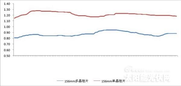 硅片价格受硅料影响有限,截止2014年年底,156多晶硅片价格为0.88美元/片。较年初0.93美元/片下降0.05美元/片;156单晶硅片价格为1.18美元/片,回落至年初水平。