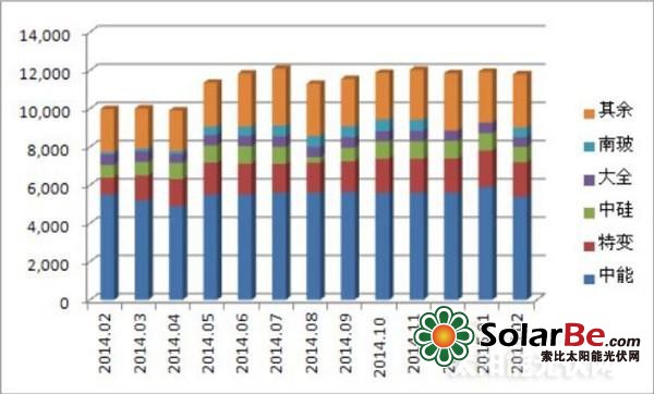 硅业分会统计,2015年1-2月份国内多晶硅产量为2.37万吨,1月份产量为1.19万吨,2月份产量为1.18万吨。目前全国在产企业17家(包括正常检修企业),江苏中能和特变电工均超负荷运行,目前江苏中能6.5万吨/年改良西门子法及3000吨/年硅烷流化床产能运行稳定,已经保持每月5900吨(按31天算)左右的产量运行。