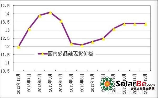 2013年初多晶硅市场止跌反弹,国内现货价格从12年年底的12万元/吨温和上涨至3月底的14.3万元/吨,增幅19.2%,但从4月初开始多晶硅价格逐渐回落,主要是“双反”预期推迟、国外多晶硅倾销加剧、企业出货艰难等因素导致。6月底价格降至12.1万元/吨,跌幅为15.4%。7月初开始,随着业内对“双反”裁决的预期,我国多晶硅价格呈温和上涨态势,直到2013年7月18日商务部发布公告对产自美韩的太阳能级多晶硅采取临时反倾销措施,在反倾销初裁出台的利好因素刺激下,多晶硅价格一路阶段性温和上涨至10月中旬的13.5万元/吨,增幅为11.6%。随后多晶硅价格小幅回落后又回升至12月底的13.5万元/吨。