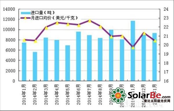 根据海关数据统计,2014年12月份我国多晶硅进口量仍高达9206吨。2014年全年累计进口102177吨,同比增长26.7%,创历史进口最高纪录。硅业分会预计2015年上半年开始多晶硅加工贸易将逐步减少,一月份进口环比下行,直到8月份才能全部结束。预计2015年多晶硅进口呈现逐步下降趋势,对比国内外多晶硅企业情况,全年进口总量将会有一定幅度的下调。