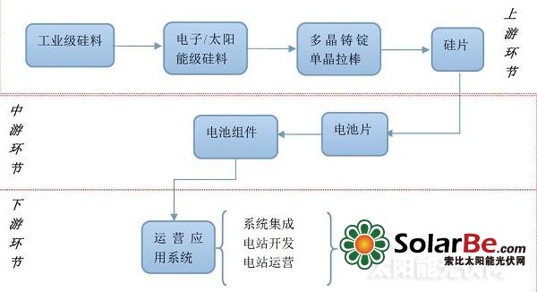 光伏发电产业链主要包括硅料、硅片、电池片、电池组件和运营应用系统5个环节。其中,硅料、硅片属于上游产业区;产业的中游环节是电池片、电池组件环节;运营应用系统为产业的下游环节。