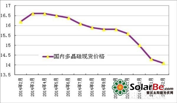 2014年第一季度,国内多晶硅现货自13年年底13.5万元/吨稳步上升至2014年3月16.6万元/吨,增幅22.9%,随后价格总体呈现下滑趋势,从4月初到10月,现货成交价格均为小幅下滑,10月之后价格下降幅度变大。