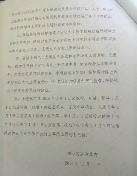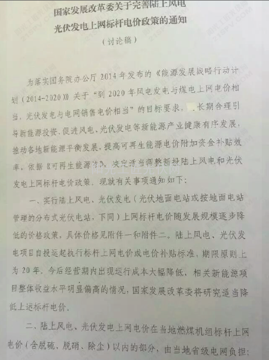 国家发展改革委关于完善陆上风电光伏发电上网标杆电价政策的通知(讨论稿)