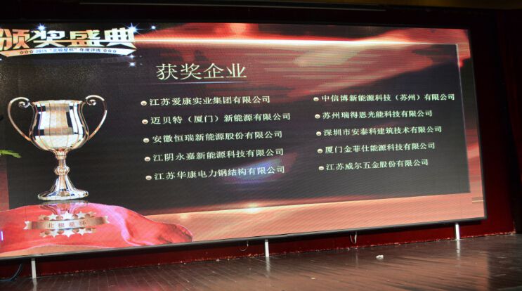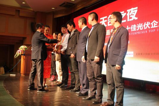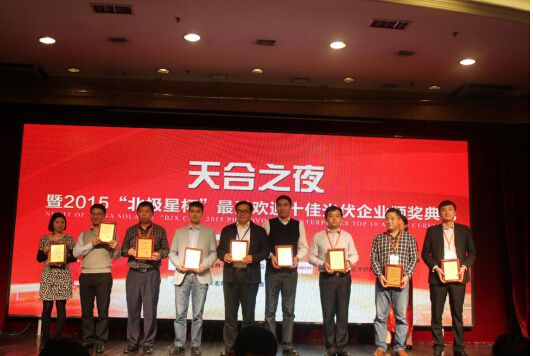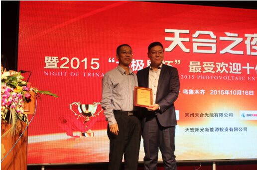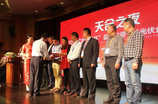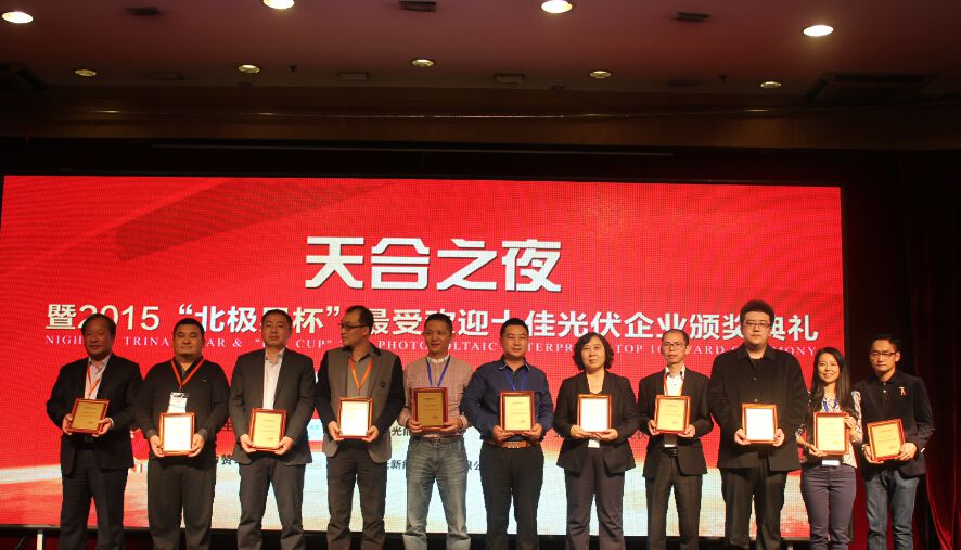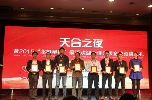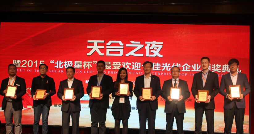 2015年10月16日,天合之夜暨2015“北极星杯”年度最受欢迎十佳光伏企业颁奖典礼在新疆乌鲁木齐美丽华大酒店隆重举行,近两百名嘉宾莅临现场,共襄盛举。常州天合光能有限公司中国区总裁孙荣华、福建中闽投资集团胡建华、中国电建西北勘测设计研究院有限公司所长马高祥、中国质量认证中心新能源业务部发展总监张雪、广东电力开发有限公司总经理杨柏应邀出席并为获奖企业颁奖。