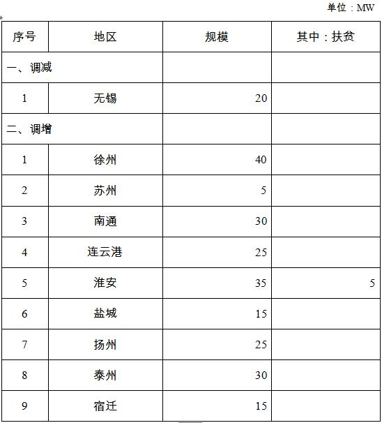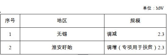 一、本次调整包括调减规模和调增规模。同意无锡市调减省补规模2.3MW、调减年度光伏电站建设规模20MW;其调出的20MW、以及国家能源局国能新能〔2015〕356号文调增我省的200MW,合计220MW年度光伏电站建设规模,用于调增徐州等9市年度规模。具体规模安排见附件1、2。