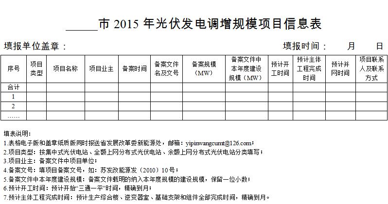 按照《省发展改革委关于开展2015年度光伏发电新增建设规模调剂工作的通知》(苏发改能源发〔2015〕839号),部分地区按要求提出了2015年光伏电站建设规模的调整意见。结合9月24日国家能源局印发的《关于调增部分地区2015年光伏电站建设规模的通知》(国能新能〔2015〕356号),并根据国家和省光伏发电有关管理规定,以及省发展改革委《关于下达2015年度光伏发电新增建设规模的通知》(苏发改能源发〔2015〕342号)、《关于定期报送光伏发电项目完成情况的通知》(苏发改能源发〔2015〕543号)要求,在充分考虑各市2015年度光伏电站新增建设规模完成实绩以及各市提出的调整意见等基础上,经研究,现调整部分地区光伏电站年度建设规模,并就有关要求通知如下: