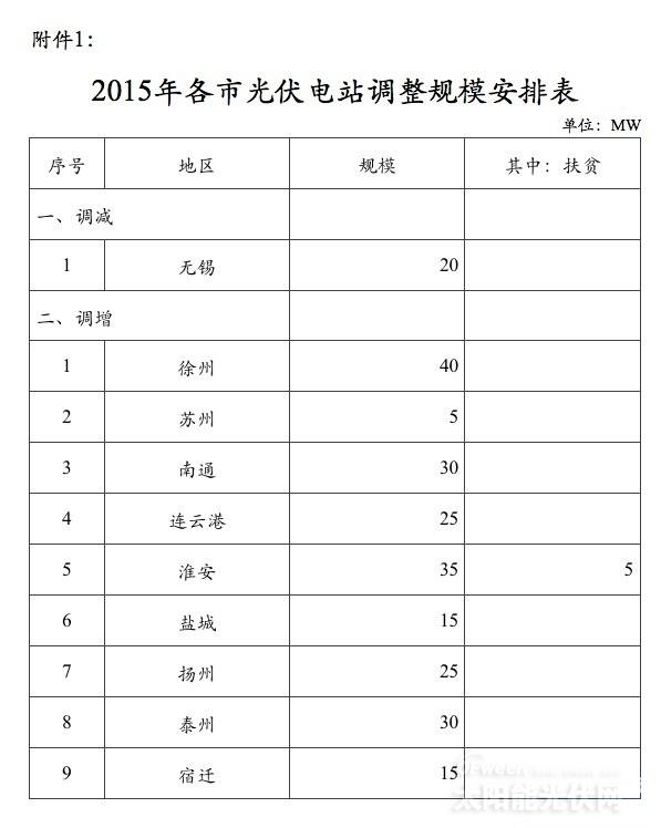 按照《省发展改革委关于开展2015年度光伏发电新增建设规模调剂工作的通知》(苏发改能源发〔2015〕839号),部分地区按要求提出了2015年光伏电站建设规模的调整意见。结合9月24日国家能源局印发的《关于调增部分地区2015年光伏电站建设规模的通知》(国能新能〔2015〕356号),并根据国家和省光伏发电有关管理规定,以及省发展改革委《关于下达2015年度光伏发电新增建设规模的通知》(苏发改能源发〔2015〕342号)、《关于定期报送光伏发电项目完成情况的通知》(苏发改能源发〔2015〕543号)要求,在充分考虑各市2015年度光伏电站新增建设规模完成实绩以及各市提出的调整意见等基础上,经研究,现调整部分地区光伏电站年度建设规模,并就有关要求通知如下: