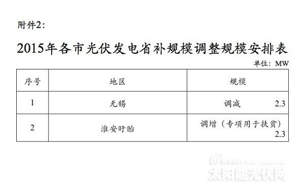 一、本次调整包括调减规模和调增规模。同意无锡市调减省补规模2.3MW、调减年度光伏电站建设规模20MW;其调出的20MW、以及国家能源局国能新能〔2015〕356号文调增我省的200MW,合计220MW年度光伏电站建设规模,用于调增徐州等9市年度规模。具体规模安排见附件1、2。