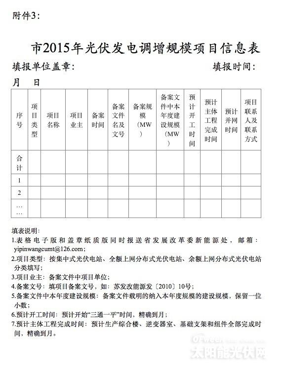 四、各有关市要在调增规模下达后一周内完成备案工作。11月10日前,按照附件3格式以正式文件形式报送省发展改革委。12月31日前,项目主体工程全部完成,具备并网条件。2016年1月31日前,项目要全部并网发电。请省电力公司加强对接,落实电网接入,及时办理相关手续,加快配套电网送出工程建设,确保光伏电站项目建设与配套电网同步投产和运行。