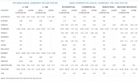 如下表所示,澳大利亚的联网家用和商用太阳能系统安装成本分别在1.76美元/瓦和1.61美元/瓦,全世界最低。