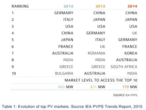 基于这个原因,2014年,在国际能源署的全球十大太阳能光伏市场中,澳大利亚从第十名提高至第八名。截止2014年底,澳大利亚光伏装机容量达到4.1吉瓦,预计到今年底,这一数据有望突破5吉瓦。