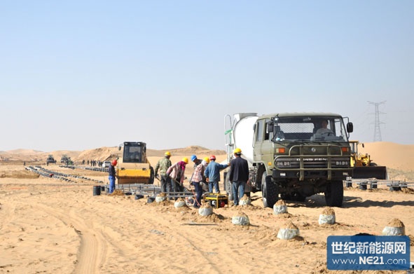晚秋时节,寒意渐浓,走进内蒙古自治区鄂尔多斯市达拉特旗昭君镇中部的库布齐沙漠,天空高远湛蓝,阳光明媚和煦,昔日沉寂荒芜的沙漠如今焕发出勃勃生机——内蒙古能建恒达新能源有限公司一期100兆瓦沙漠生态光伏发电项目正在如火如荼地建设中。一大片平整过的沙漠上,各种机械车辆往来穿梭,轰鸣声不绝于耳,许多工人正忙着施工,一派热火朝天的景象,蔚为壮观。