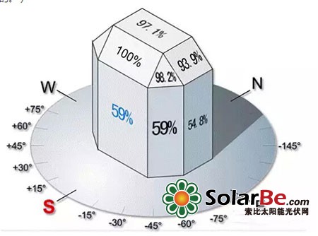 答:由于影响光伏发电的主要原因为日照量,所以组件安装时应向阳光最充足的方向安装。不同安装角度对光伏组件的发电效率亦有影响。下图展示了中国南方某城市光伏组件各朝向的不同效率。(注意:不同地点和不同气候条件下,不同朝向的光伏电池发电效率是不同的。)