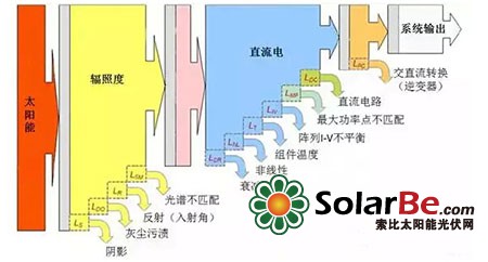 答:光伏发电系统效率受外界影响有所损失,包括遮挡、灰层、组件衰减、温度影响、组件匹配、MPPT精度,逆变器效率、变压器效率、直流和交流线路损失等,如下图所示: