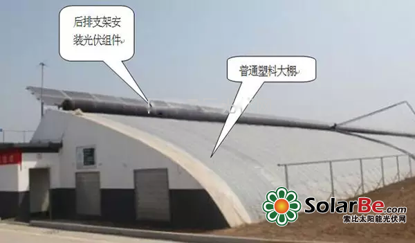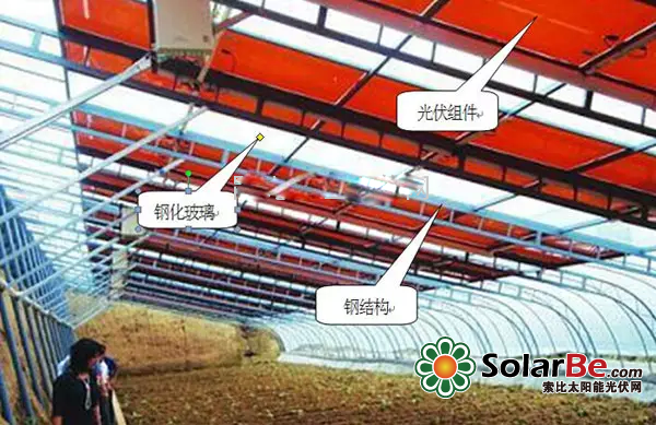 南侧,发电组件和专用附框与钢骨架柔性连接;北侧,屋顶部位采用普通夹胶玻璃;南北侧,立面采用钢化大板玻璃,此类型大棚成本较高,但装机量大,可添加的其他可选辅助设备多,可建成及观光旅游和生态农业一体化的智能型新型农业大棚。