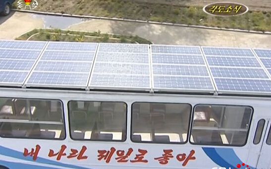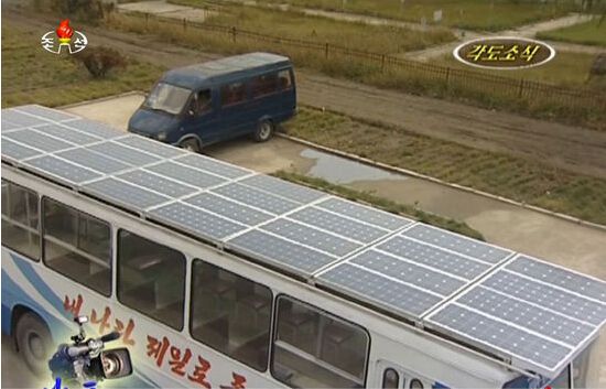索比光伏网讯:2015年11月3日消息,朝鲜中央电视台播放的画面显示,朝鲜正在开发运行新动力能源的公交车。这些南浦市的新公交车搭载32块1100瓦特的太阳能电池板,同时配备电动机,最多可搭载140人,最高时速为每小时40千米。