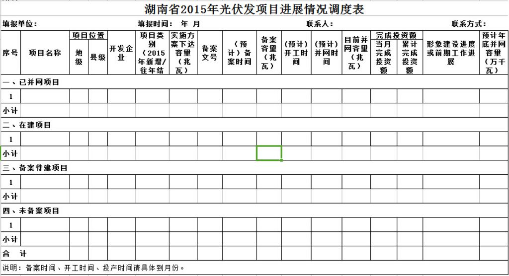 2、光伏项目,按《关于转发下达2015年光伏发电建设实施方案的通知》(衡发改能源[2015]10号)和《关于调整2015年光伏发电建设实施方案部分项目和规模的通知》(衡发改能源[2015]18号)所确定的项目进行调度,包括项目备案、建设进度等,并填写附件4。
