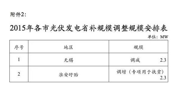 江苏省发改委同意无锡市调减省补规模2.3MW、调减年度光伏电站建设规模20MW;其调出的20MW、以及国家能源局国能新能〔2015〕356号文调增我省的200MW,合计220MW年度光伏电站建设规模,用于调增徐州等9市年度规模。并优先支持各地已纳入2015年度规模且进展快的投资主体申请的项目,优先支持光伏扶贫项目。此外,12月31日前,项目主体工程全部完成,具备并网条件。2016年1月31日前,项目要全部并网发电。