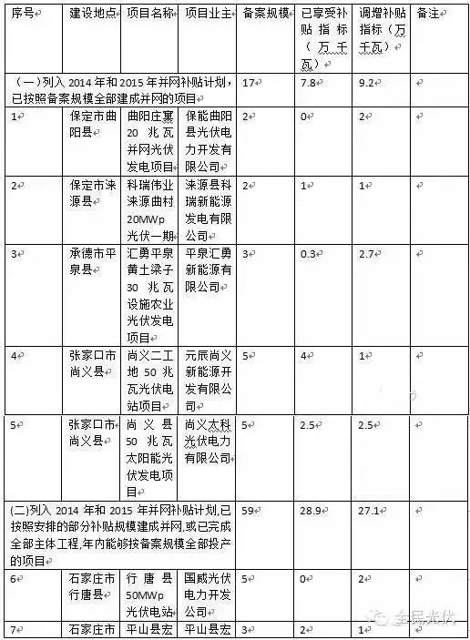 根据2014年后的项目进展情况以及此前国家能源局调整河北光伏建设规模新增700MW等多个因素,调减7个项目、总机118MW的补贴计划,并对项目进展符合预期的22个项目、总计473MW的装机规模进行调增光伏补贴计划。