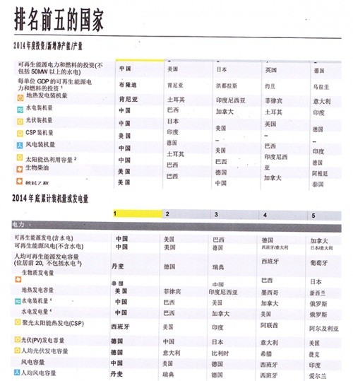 2014年各种新能源发电的全球比重国家排名,中国光伏发电容量仅次德国,但人均光伏发电容量却跌出前五。