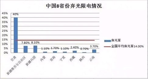 2014年7月—2015年5月,甘肃、内蒙、新疆、青海、宁夏、西藏、云南、陕西8个省份的光伏电站面临弃光限电问题,全国平均弃光率达14%,最高地区甘肃省弃光率达到40.2%。