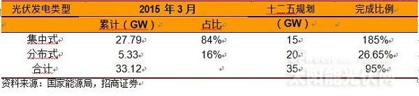 从装机规模目标的连续上调来看,我国政府鼓励发展光伏产业的态度坚定,产业扶持重心也从生产制造业转向下游运营。截至2015年3月,我国集中式光伏已完成规划目标,但分布式光伏的完成情况并不乐观,仅完成规划目标的26.65%,尚有巨大差距。