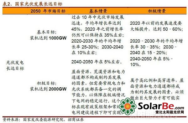 ●我国2050年光伏发电基本市场目标将达到1000GW,积极目标达到2000GW,争取可再生能源发电量占60%以上,7.2万亿kWh。