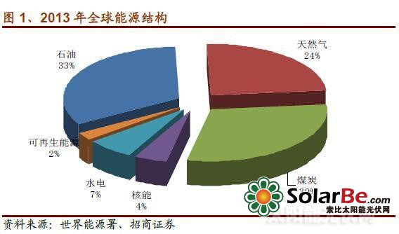 从全球的视角来看,截至2014年,全球能源结构中,石油、煤炭、天然气仍然位列一次能源前三甲,分别占全球能源消耗总量的32.9%、30.1%和23.7%,比重有所下降。而可再生能源(包含风电、太阳能等)占到2.2%,较2010年提升了近1个百分点。