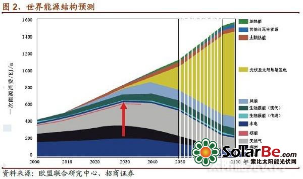 虽然目前太阳能占全球能源消耗的比重很低,但世界各国普遍看好太阳能未来的发展。根据欧洲光伏工业协会EPIA预测,太阳能光伏发电在21世纪会占据世界能源消费的重要席位,不但要替代部分常规能源,而且将成为世界能源供应的主体。