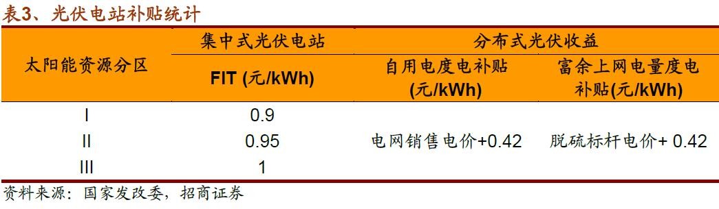 光伏发电的整体成本仍然远高于传统能源发电,相应在售电电价方面不具备优势,因此需要从国家层面进行补贴。对于集中式光伏电站,执行标杆电价:全国按太阳能资源条件和建设成本分为三类资源区,分区制定集中式光伏电站标杆电价(统购统销模式):0.90、0.95、1.0元/kWh。