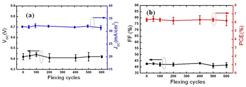 图2. 在不同弯折次数下,柔性硅基太阳电池的光伏稳定性 索比光伏网 https://news.solarbe.com/201511/08/181290.html