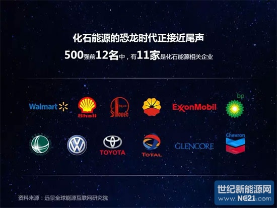 如果我们把视野转到我们的经济社会,2015年的500强前12名当中,你会发现有11家是化石能源相关的企业,其中9家是化石能源的生产和交易商。