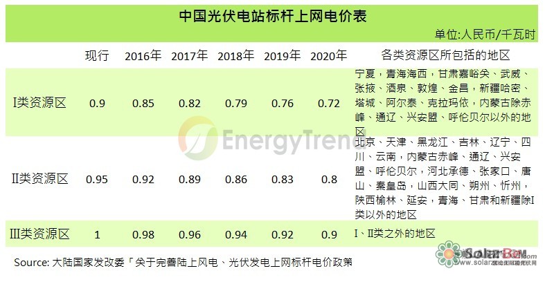 日前,国家发改委下发的《关于完善陆上风电、光伏发电上网标杆电价政策的通知》指出,2016年中国太阳能电站并网价降幅不大,除了第一类资源区(西部限电情况较多的宁夏、青海、新疆等地)降幅达5.56%之外,第二(北京、天津等中部及限电情况不严重的部分青海、甘肃、新疆等地)、第三类资源区(限电不严重的东部地区)降幅皆未超过5%。
