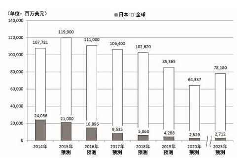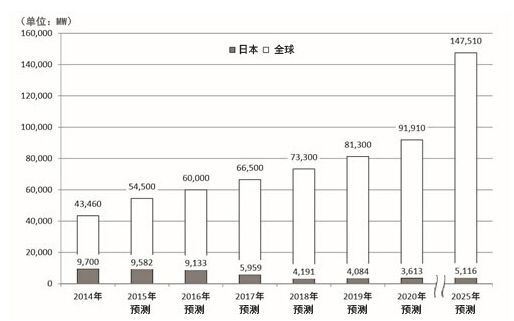 除了中国和美国外,东南亚、印度、非洲及大洋洲等地区的设置也将增加,2015年至2025年期间,预计全球市场按容量计算将以年均10.5%的增长率扩大。但市场的电池板供货价格今后将会继续下跌,按金额计算,2015年至2025年期间将以年均4.2%的比率减少。