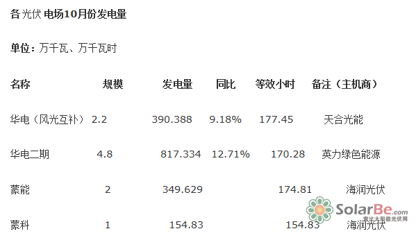 其中,华电风光互补电场2.2万千瓦光伏发电场10月份发电量为390.388万千瓦时。华电二期4.8万千瓦光伏发电场10月份发电量为817.334万千瓦时。